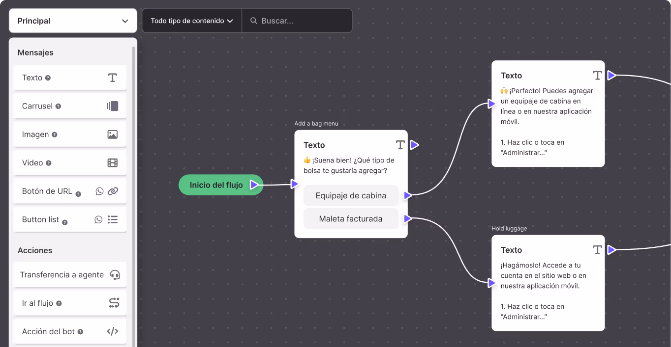 Crea y escala Agentes de IA en WhatsApp o en cualquier canal de mensajería. Gestiona la automatización con control y seguridad para lograr un impacto directo en Ventas y Experiencia de Cliente. Todo en un solo lugar: diseña flujos conversacionales, construye experiencias y mide resultados con la precisión que exige el entorno empresarial.