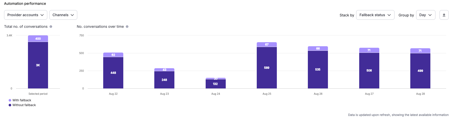 El panel de rendimiento de la automatización agrega datos de conversación en períodos de tiempo configurables y analiza dimensiones clave del éxito de la automatización, incluyendo tasas de escalamiento, interacciones significativas, uso de IA, fallback y rendimiento específico del canal.