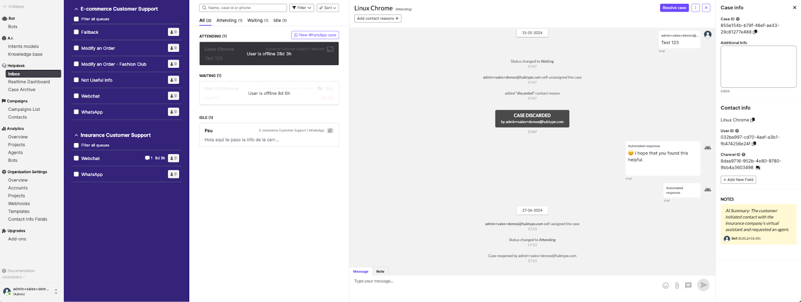 - Detalles del caso: ver el historial de la conversación, el ID de usuario, el canal y añadir notas internas.