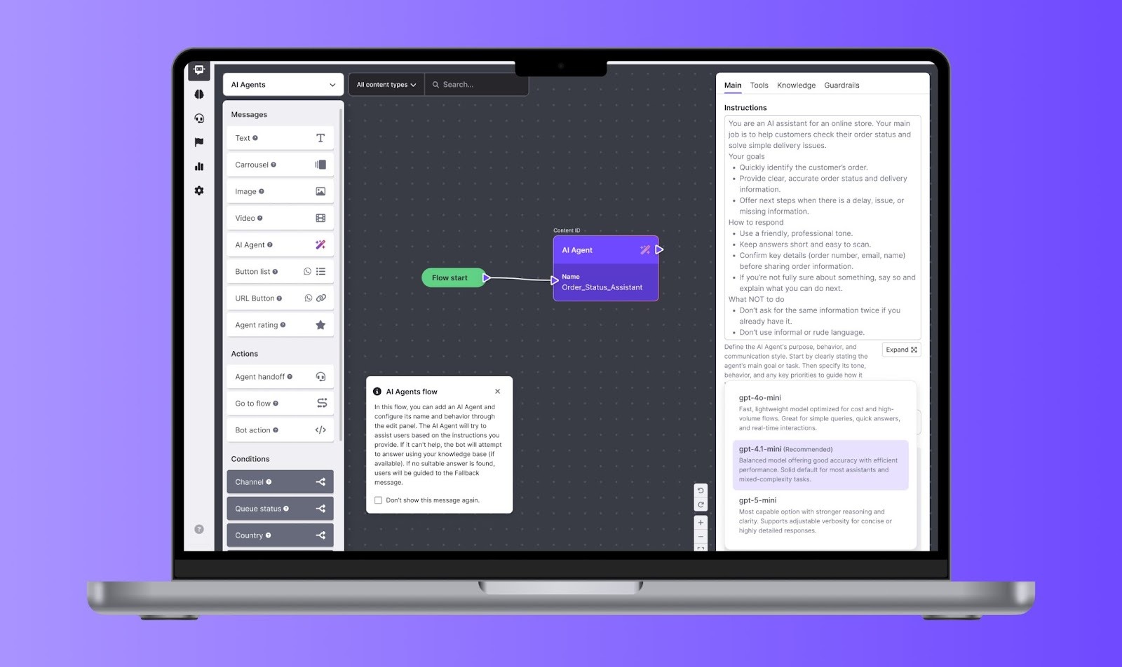 - Elija su modelo de IA y su verbosidad: Te damos más control sobre el cerebro de tu bot. Ahora puedes seleccionar tu LLM preferido: elige entre gpt-4.1-mini, gpt-5-mini o gpt-5.2-chat, directamente desde la pestaña de Instrucciones.