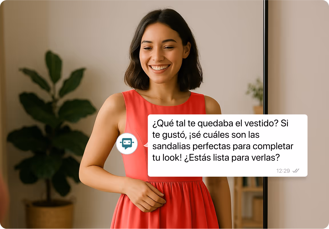 Qué hace: extiende la conversación después de la compra para completar el look, ampliar la cesta o sugerir complementos personalizados. El Sales AI Agent hace seguimiento por WhatsApp como lo haría tu mejor asesor en tienda, convirtiendo compradores puntuales en clientes recurrentes.