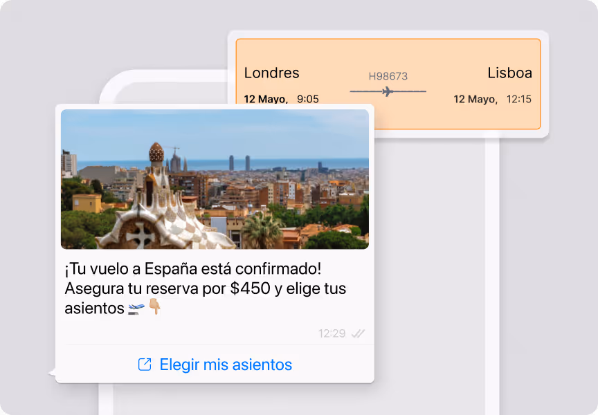 Permite que los clientes naveguen, seleccionen y compren sin salir de WhatsApp gracias a nuestros WhatsApp Webviews. Activa pagos con un clic, recordatorios de carritos abandonados y procesos de pago seguros, todo dentro de la conversación.
