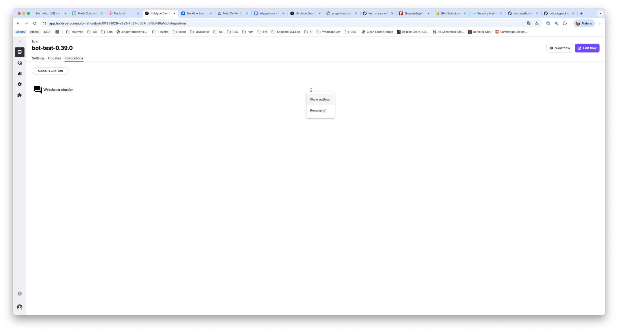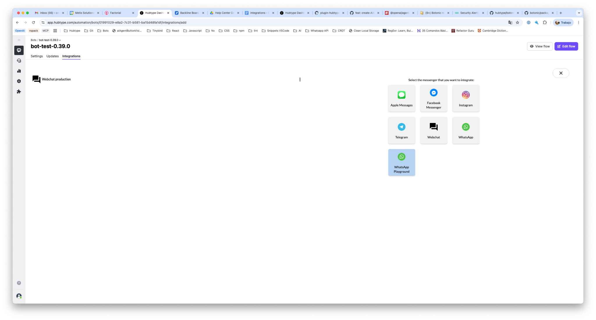 1. Go to the Integrations page/URL of a bot. Here you can see the integrations with the different channels available.