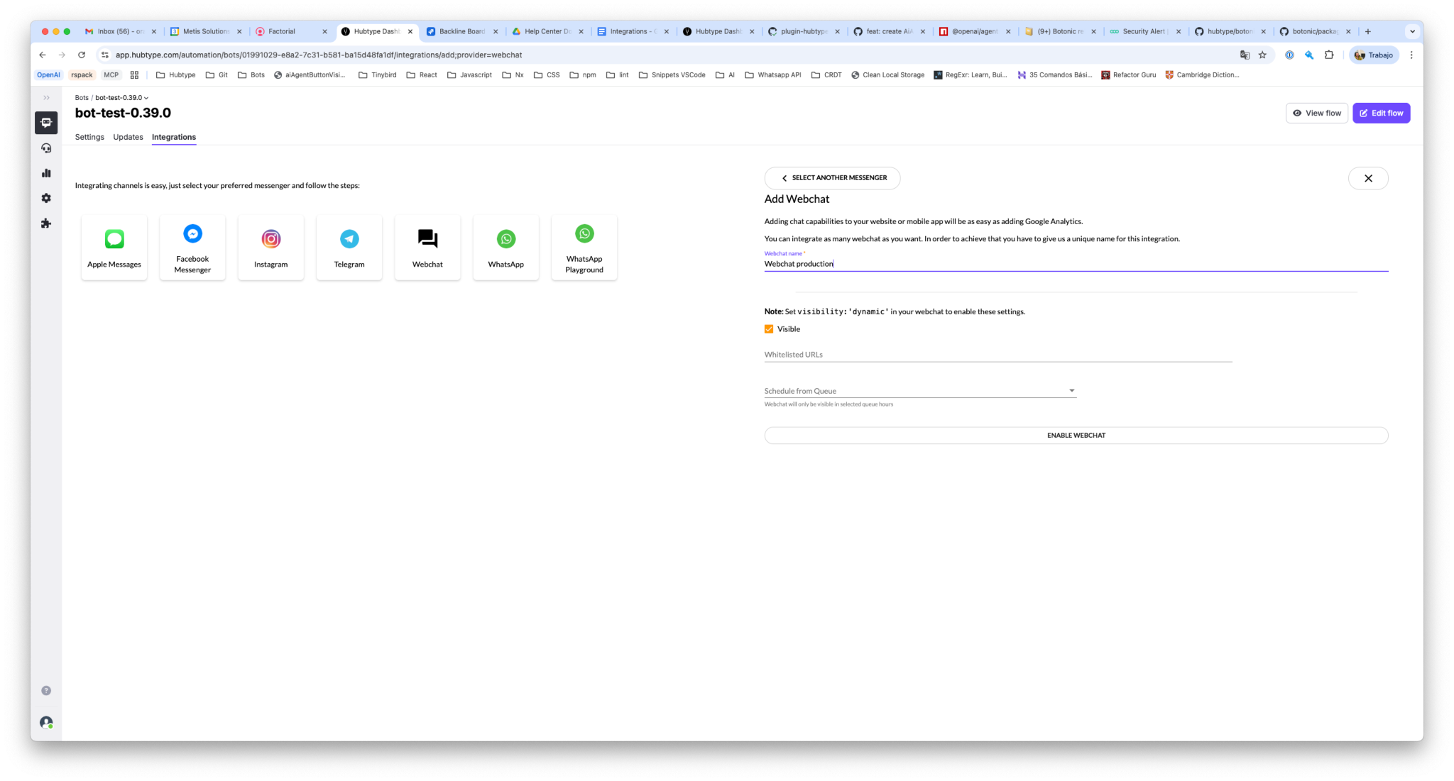 4. If you click on Add another messenger or go back to the setting tab/URL, you will see the integration created and you can see the example code again or edit the URL where the Webchat will be shown etc.
