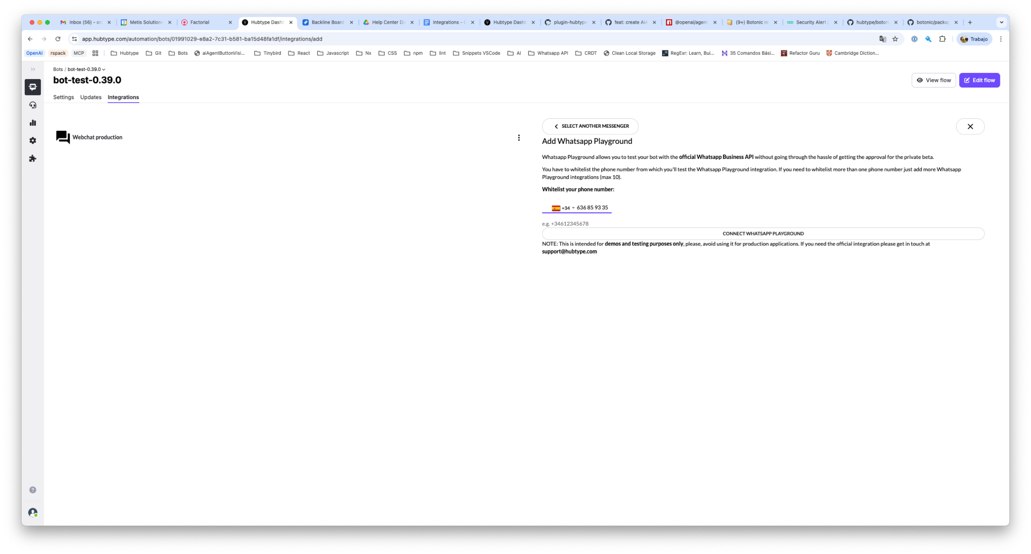 - WhatsApp Playground: This is a test number. You have to add your phone number to be able to see the experience inside WhatsApp but you can only add 10 phone numbers (can't be used for production).
