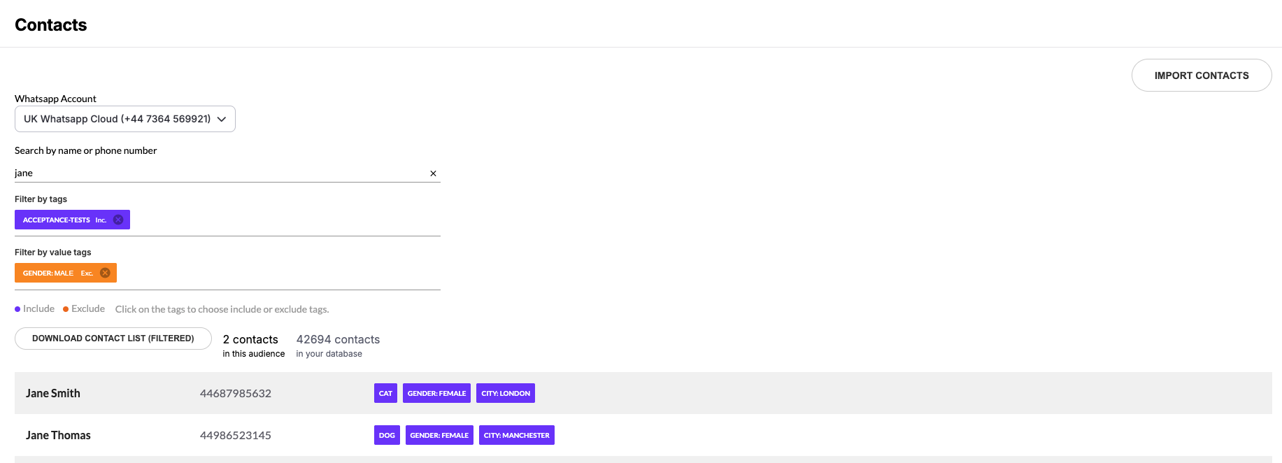 As a result of the applied filters, we can see two contacts named Jane. Both of them have the tag "dog", and neither of them has a value tag for "gender" with the value "male".