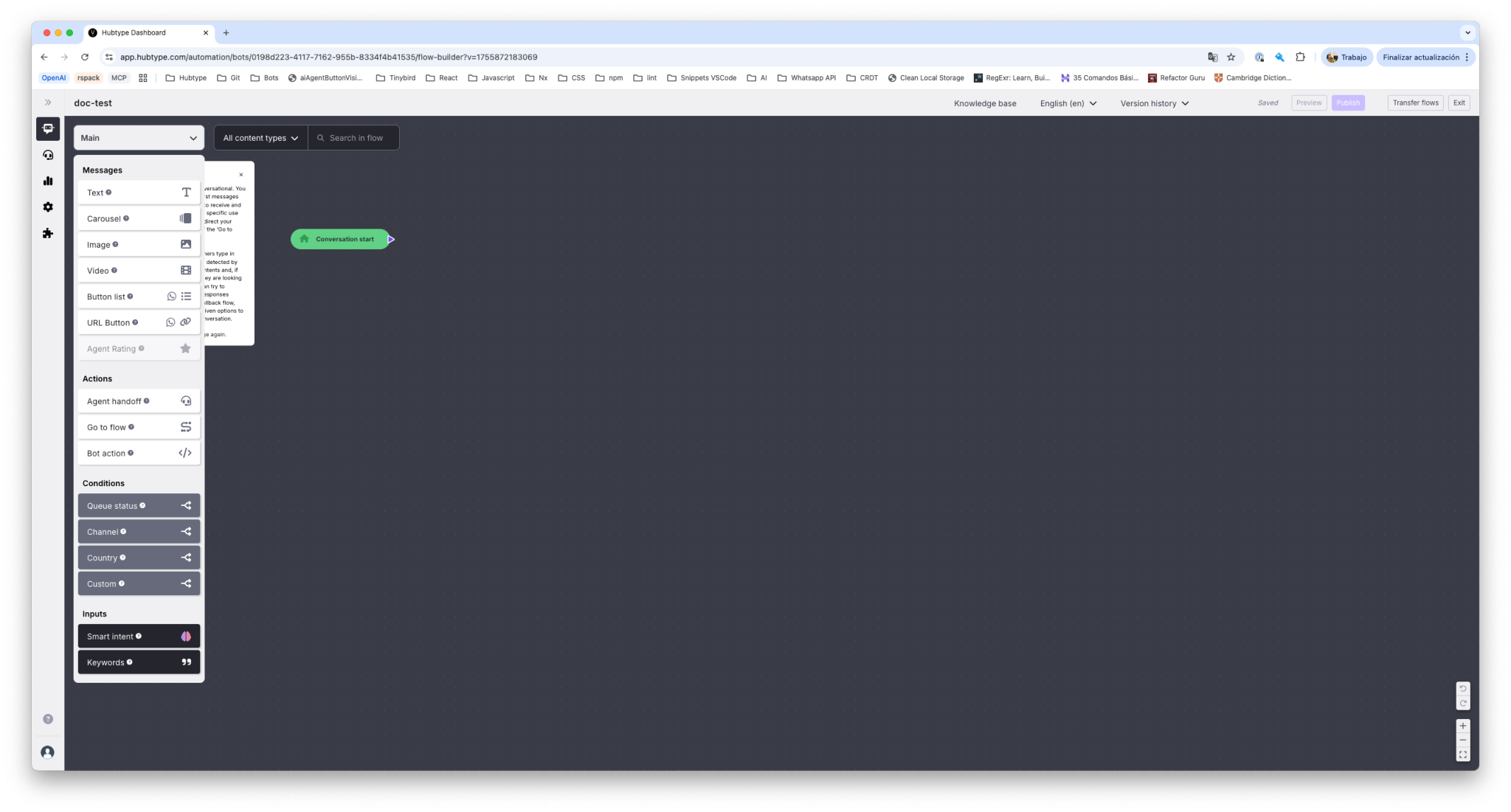 - Bot creation is part of the product. After creating the bot, it is necessary to enter the flow builder and create a flow. Once the flow is created, integrations must be set up in order to interact with the bot.