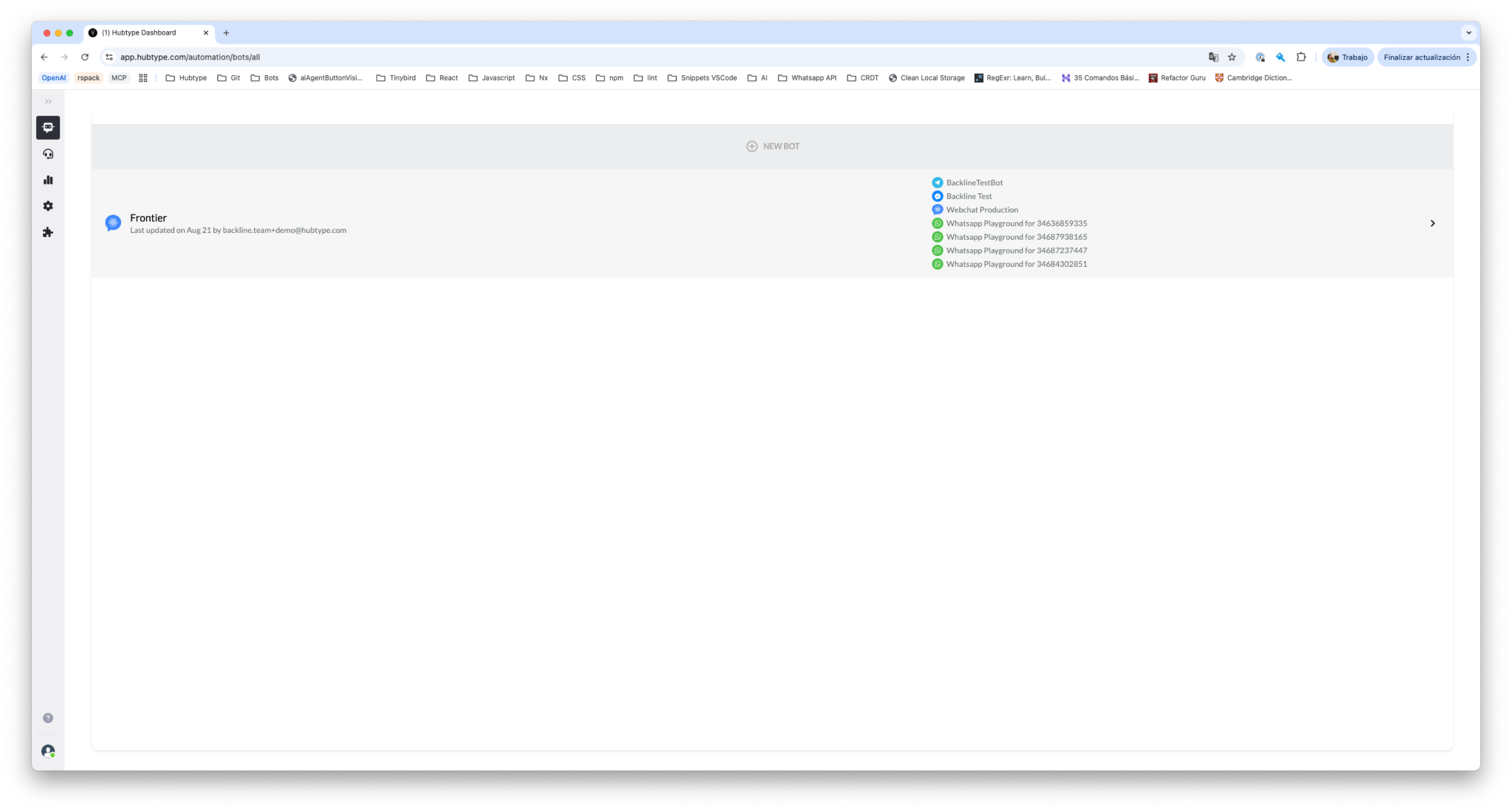 - Go to https://app.hubtype.com/automation/bots/alland and click in + NEW BOT button on the top of the page.