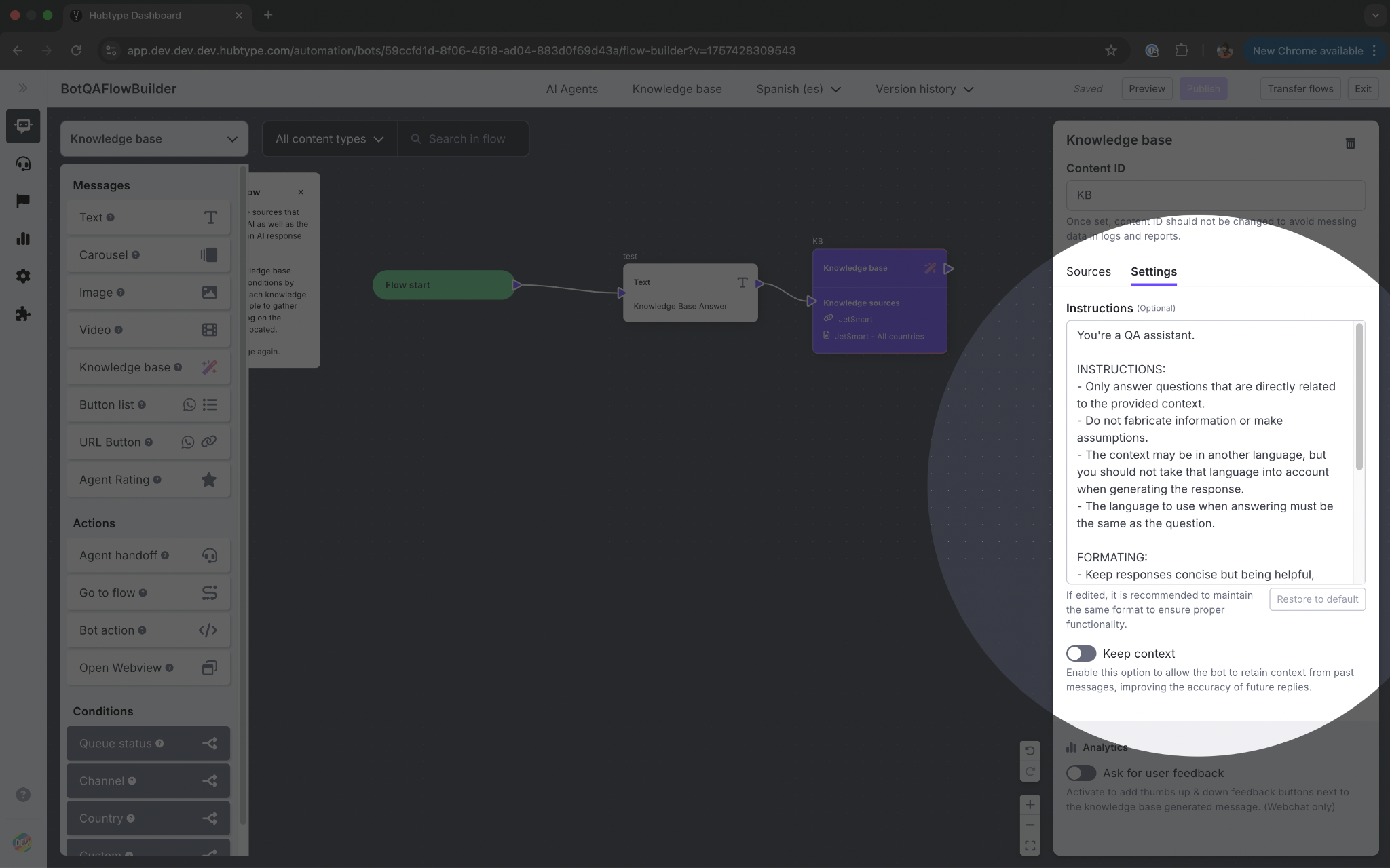 Optionally, enable context retention so the bot can use past messages to provide more accurate responses.