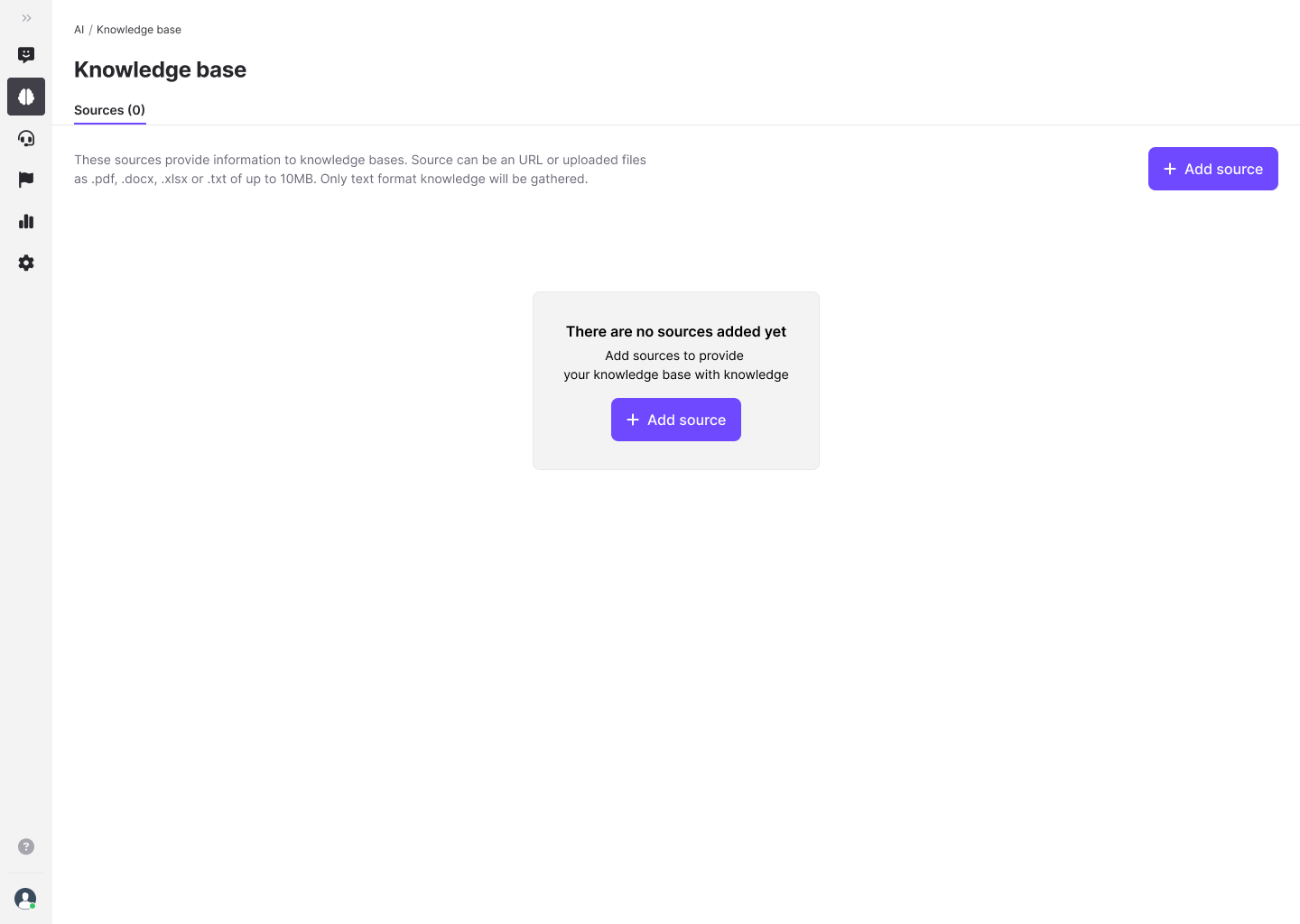 Once you have access to the Knowledge base, you will arrive to a screen indicating no sources have been added yet if it's your first time using it.